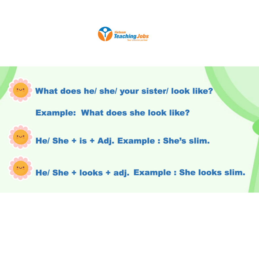 - He/She is + adj. (She is slim.)