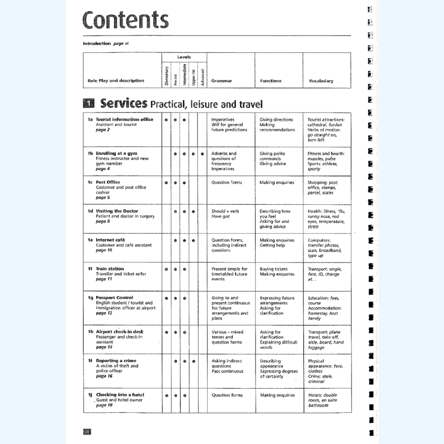 • Services (Practical, leisure, travel): Role plays for tourist offices, gyms, post offices, doctors, internet cafés, train stations, hotels, and more.