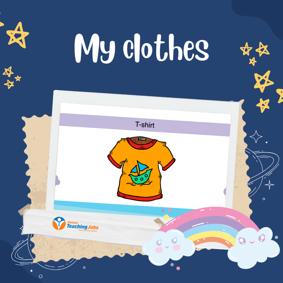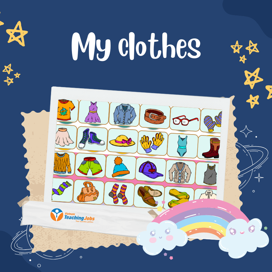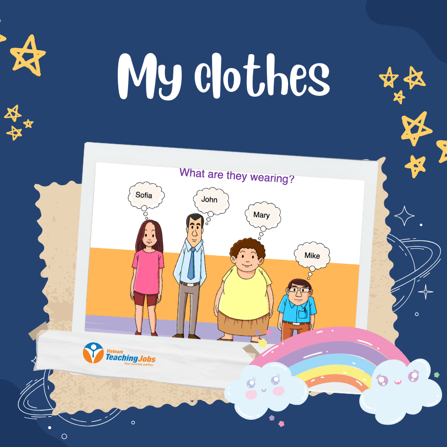 Objective: Teach students vocabulary for clothes, shoes, and accessories, and practice the question “What are you wearing?”.