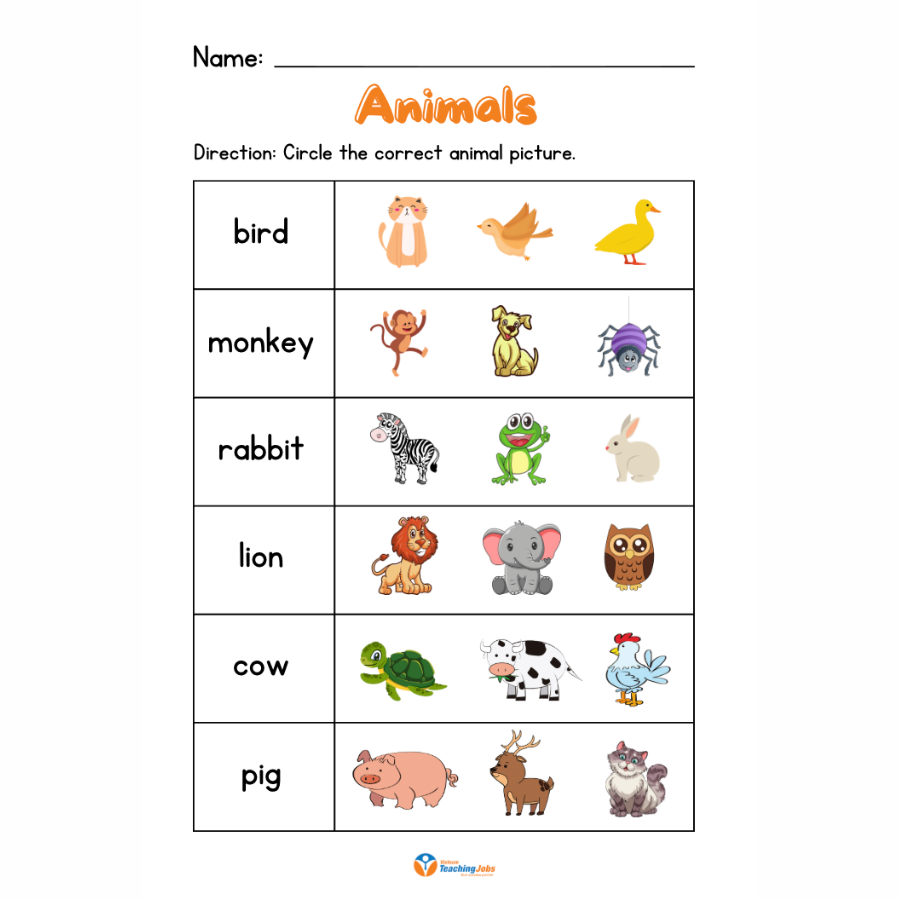• Animal Recognition: Circle the correct animal picture (bird, monkey, rabbit, lion, cow, pig).