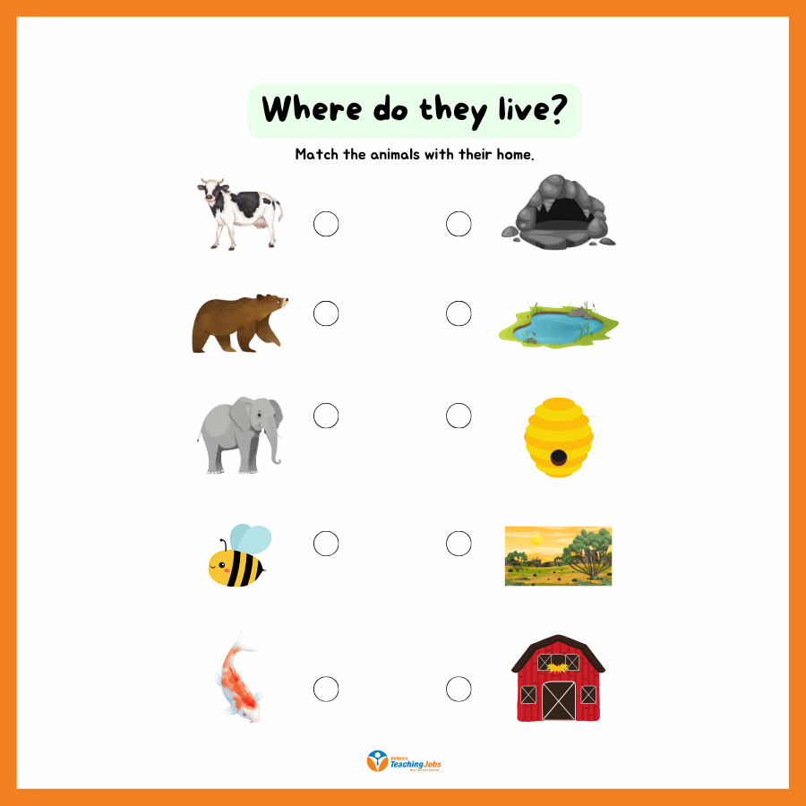 • Habitats: Match animals with their homes (e.g., fish–water, cow–farm).