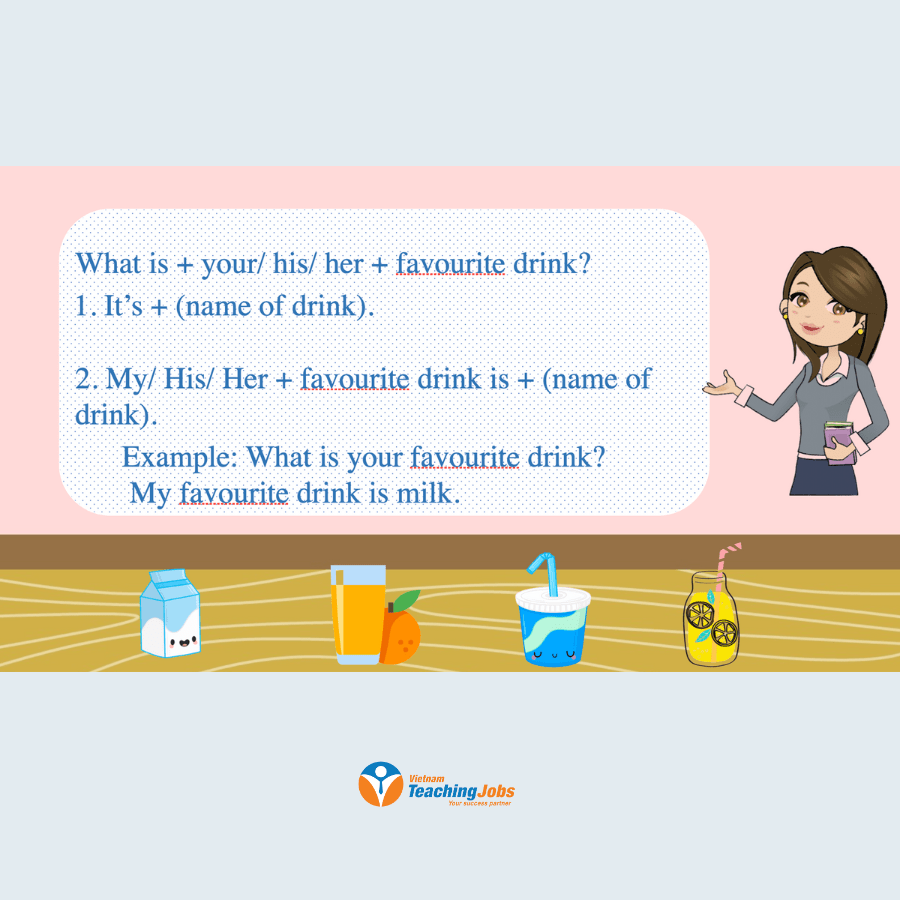 Objective: Teach students common food & drink vocabulary and practice the structure “What is your/his/her favourite food/drink?”.