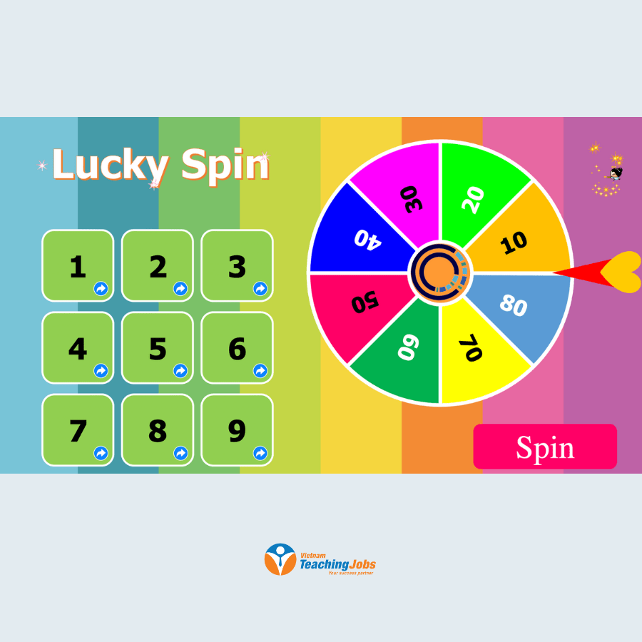 • Interactive Game – Lucky Spin: Students spin to answer questions, including: