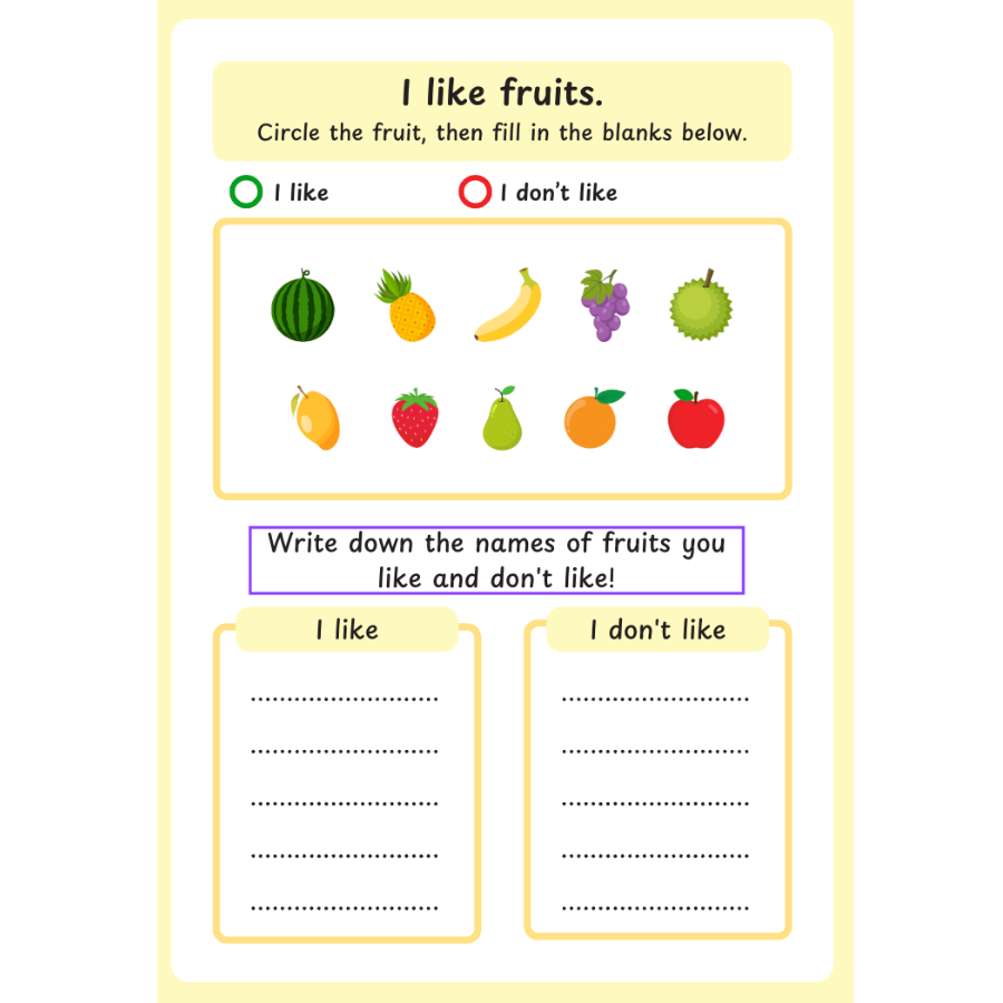 - Likes/Dislikes Chart: Write and circle fruits they like vs. don’t like.