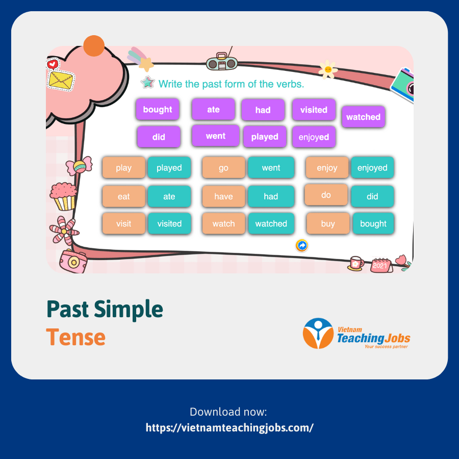 Objective: Teach and practice the Past Simple tense with to be and action verbs (regular + irregular), including affirmative, negative, questions, and Wh-questions.