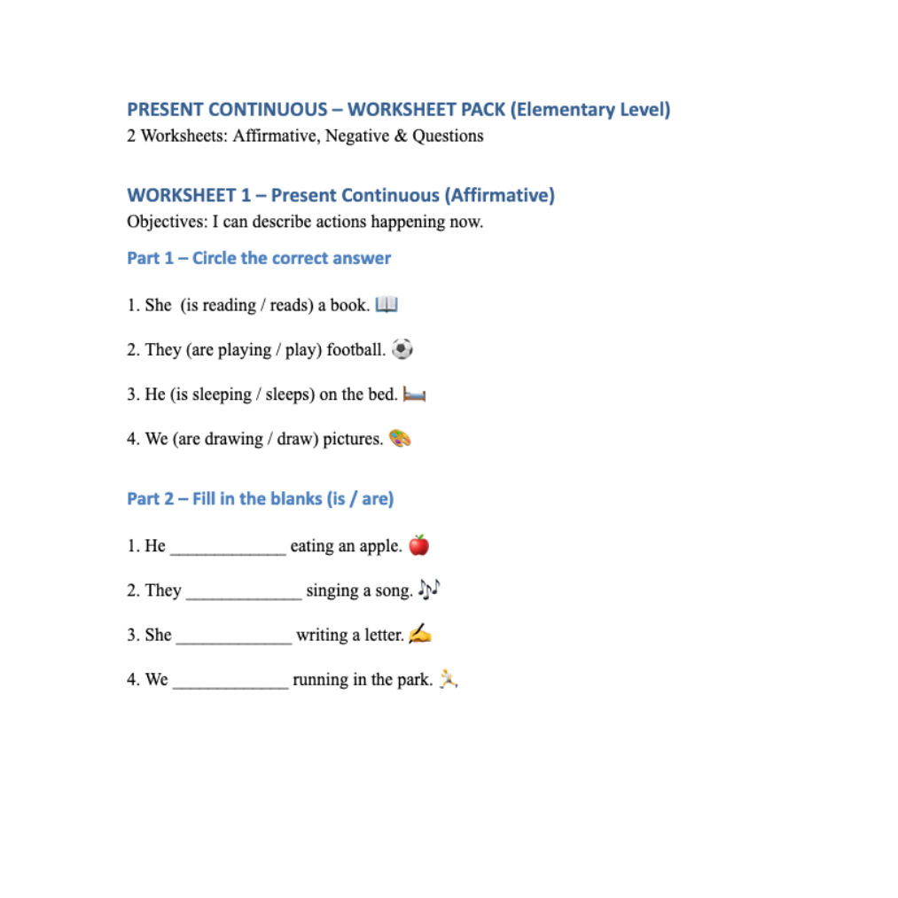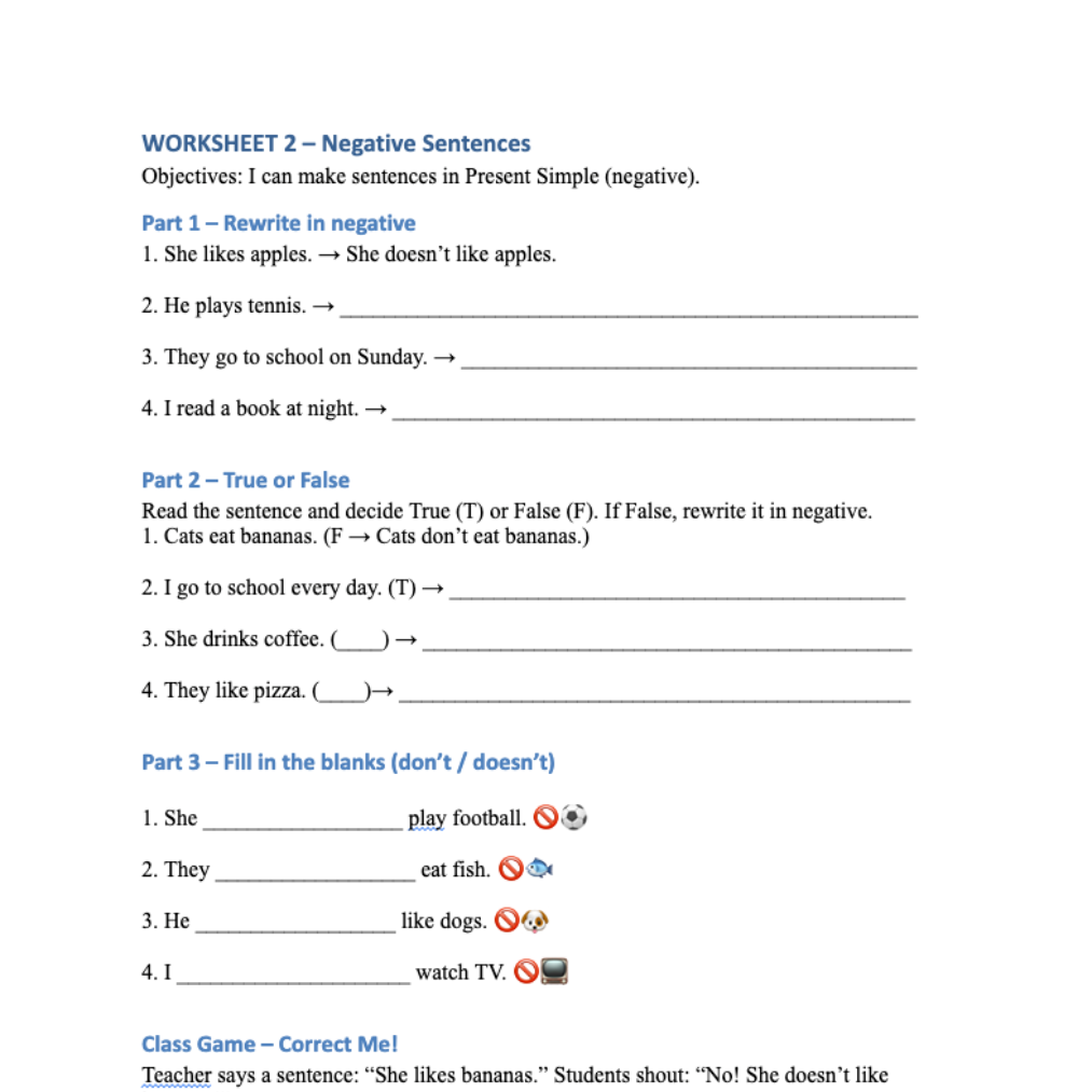 Perfect for ESL/EFL teachers who want to give students clear grammar practice combined with interactive classroom activities. Each worksheet includes fill-in sections with large spaces for writing, making it suitable for younger learners in primary school.
